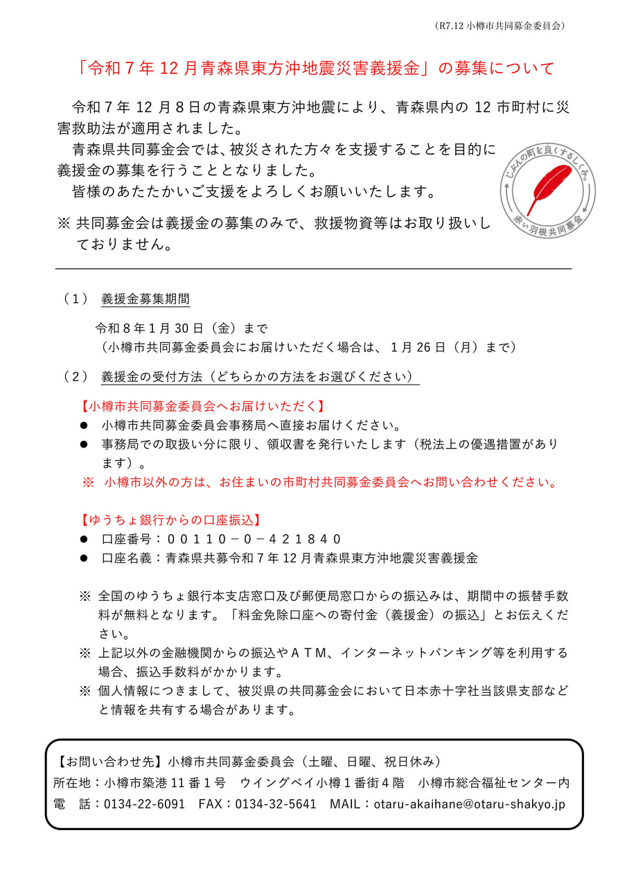 「令和7年12月青森県東方沖地震災害義援金」の募集について