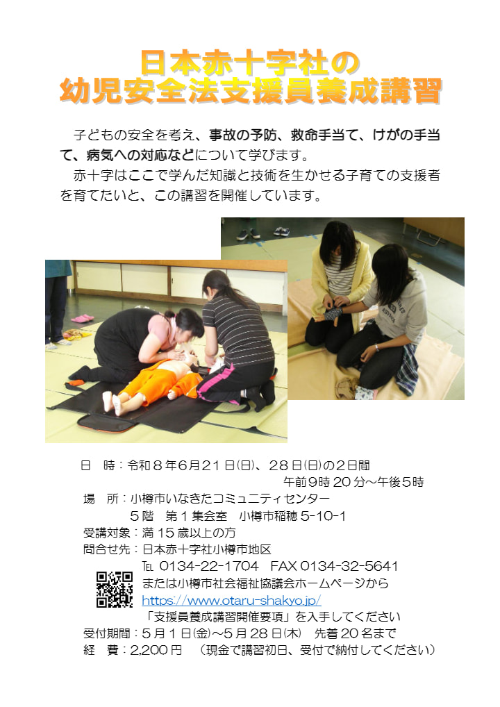 日本赤十字社小樽市地区では、6月に赤十字幼児安全法支援員養成講習を開催いたします。