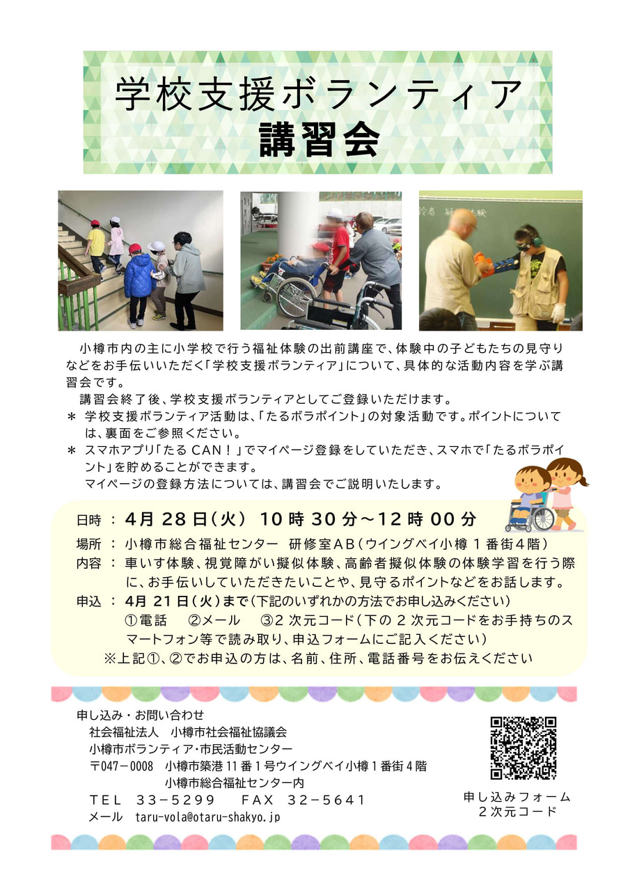 学校で実施される福祉体験活動を支える『学校支援ボランティア』について、活動内容を学ぶ講習会を開催します。
